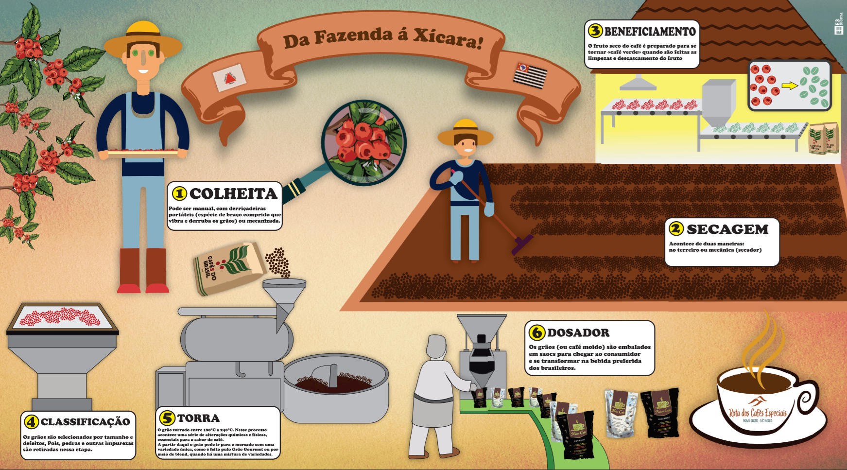 Na Rota do Café você irá conhecer todo processo produtivo do café. Uma experiência única de vivenciar os detalhes da produção, do plantio até a xícara das cafeterias.